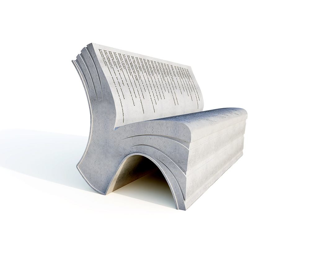 Diseñado para incorporar a nuestro paisaje innovación, y cultura. Un banco con forma de libro donde mantiene una línea ergonómica que pueda ser utilizado con comodidad, generando un espacio de descanso, homenajeando así la lectura. Su diseño propone un contraste entre la rigidez del material, y la fluidez del mundo creativo, en el encontramos la convivencia de los mundos opuestos. Lo tangible con lo intangible. Un Banco anti-vandalico, que incluye material reciclado.