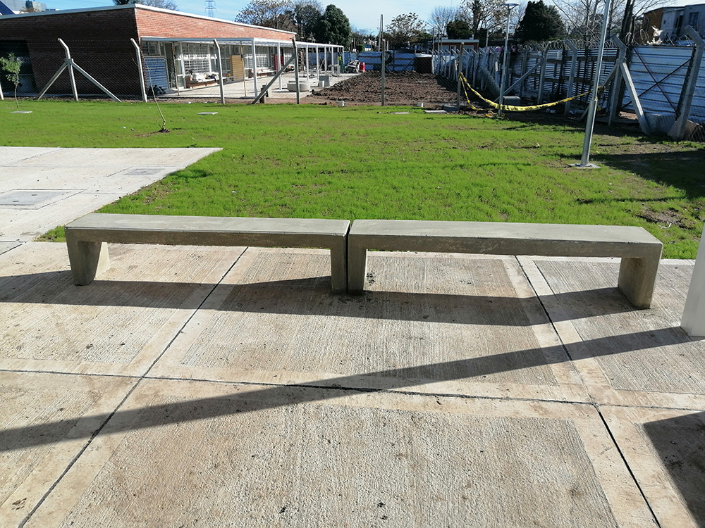 Banco de hormigón con doble malla electrosoldada reforzado con hierro en los bordes.